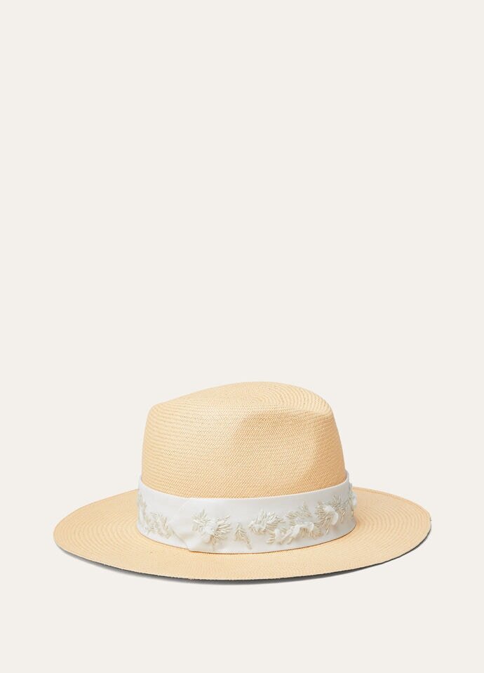 Inspired by the men’s version, the Sergio fedora is modeled on a timeless hat from Sergio Loro Piana’s wardrobe. Here rendered in lightweight Ecuadorian straw, it is made with a distinct and incredibly refined Cuenca weave, with a twill-like pattern and a mere 20 knots per inch. An embroidered ribbon with a romantic floral motif and delicate ramie adorns the top.