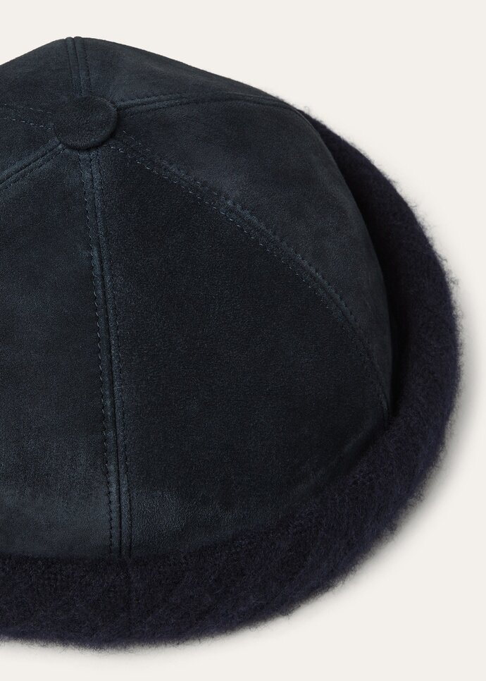 The Valeria beanie has a distinctive tubular shape. It is made from Cash Suede, a full-grain calfskin with a velvety nap and rich tactile hand. Constructed with a six-panel design and a shorter crown, it features a rib-knit turn-up, set on the diagonal, that delicately wraps the base with gentle volume.