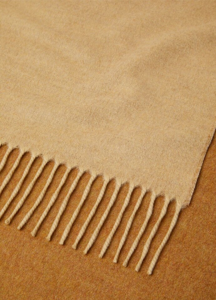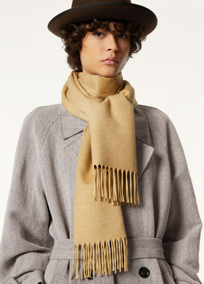 Contemporary two-tone scarf crafted from baby cashmere, and finished with long fringe trim. Perfect at the start of the season with relaxed casual ensembles.