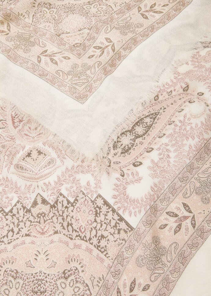 The elegance of Indian tapestry lends a sense of timeless beauty to the Punjab foulard, where paisleys and blooms emerge from the center in balanced symmetry. Screen-printed with fine precision, the design reveals layered details and subtle linework that evoke the character of hand-drawn textile art. The accessory is jacquard-woven from a featherlight blend of cashmere and silk – an elevated canvas for the refined complexity of the motif.