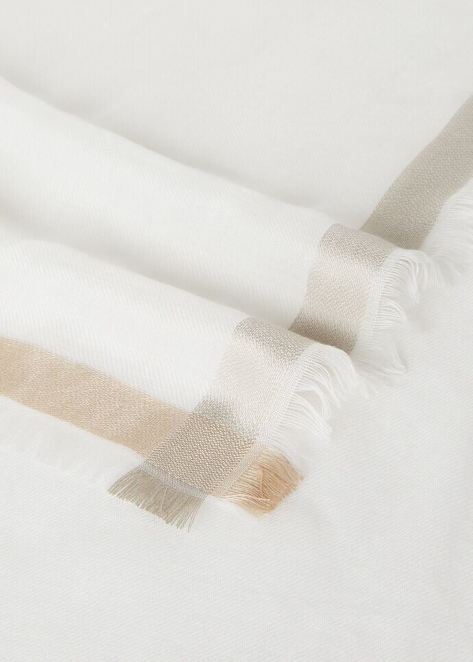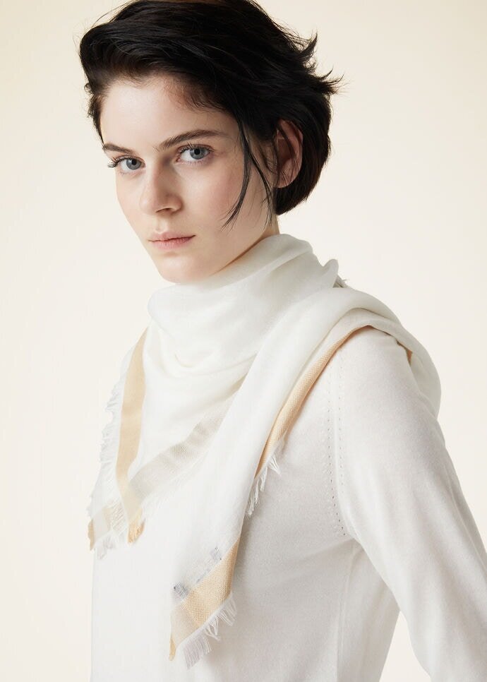 Large scarf in Soffio cashmere and silk yarn, in a light colour framed with contrasting bands of silk. The square shape guarantees versatile styling to create an endless variety of looks.