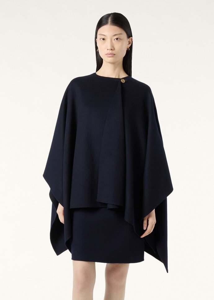 An elegant expression of ease and refinement, the Renata cape is crafted from Only Double – an ethereally light pure cashmere fabric with an exceptionally soft, gauzed finish. The shoulder seam is engineered to contour the body, forming a fluid asymmetrical line that envelops the figure with grace. At the neck, a single jewel button adds a delicate light-catching accent.