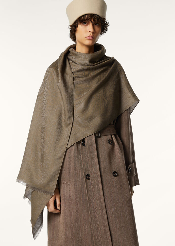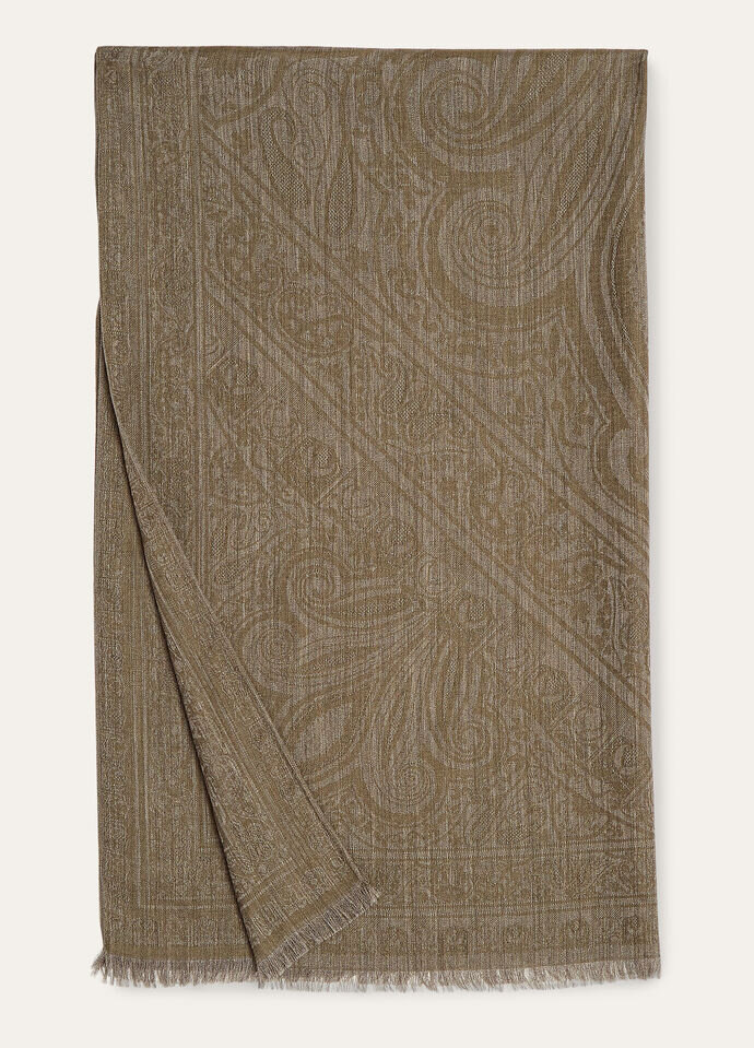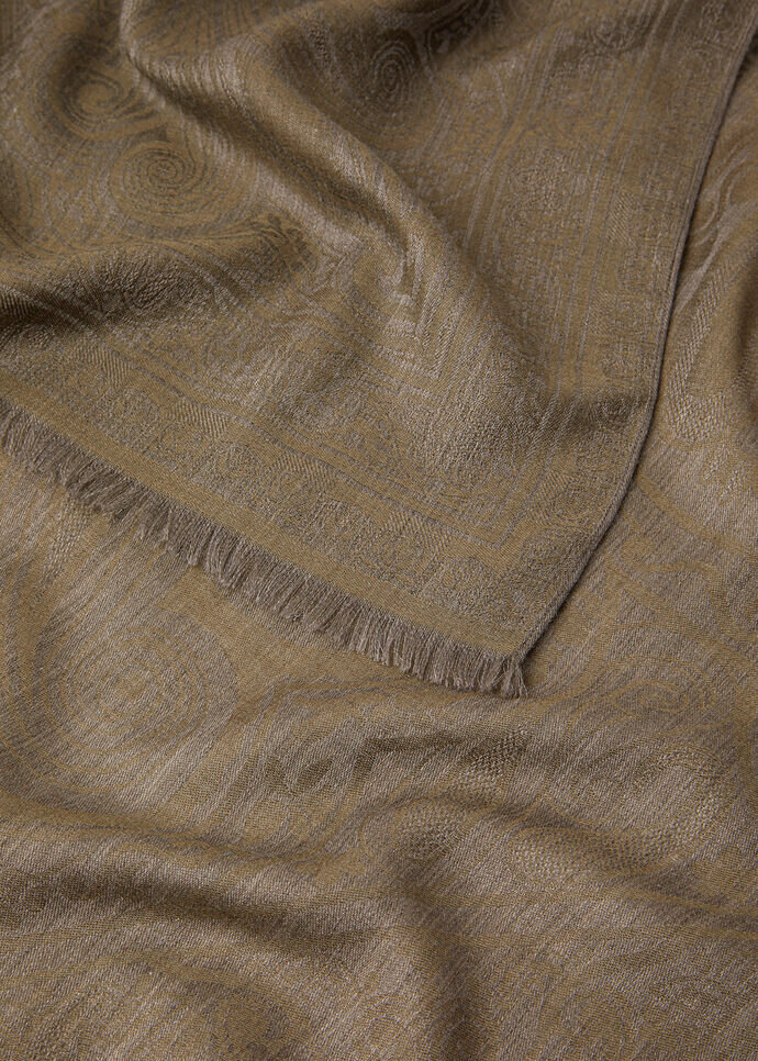 Worked with an intricate paisley jacquard motif, this stole exudes the charm and elegance of bygone days – the perfect finish for formal and informal occasions alike. It is woven from sumptuous Cashmere yarn with hints of silk for strength and luster, and has a refined palette animated by shades of taupe and brown.