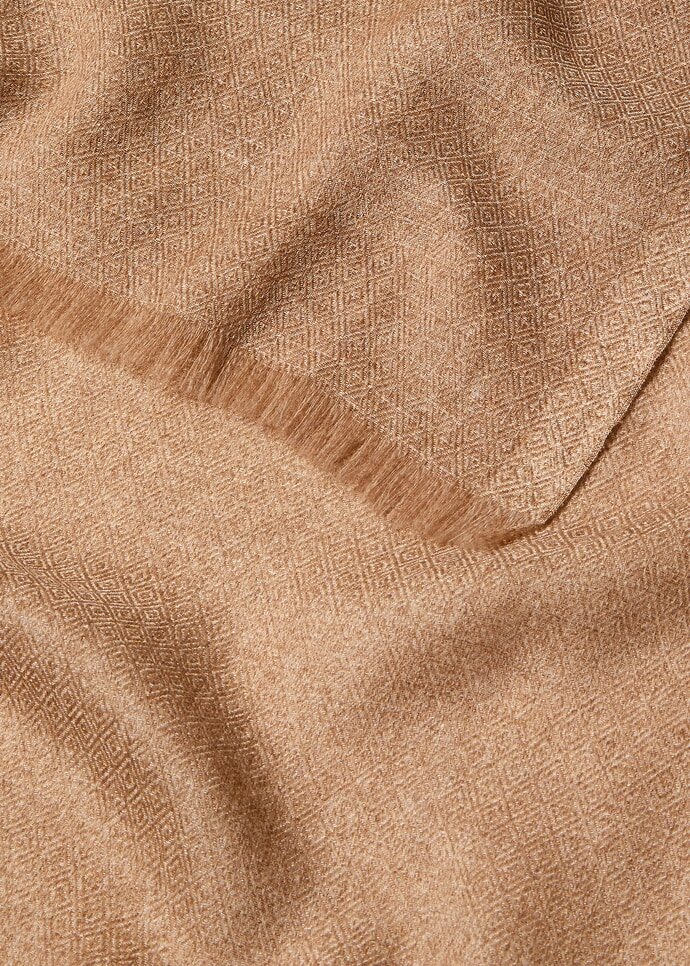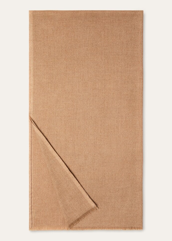 In the grand tapestry of the collection, accessories are the golden threads that weave together past and present, each subtly symbolizing the brand’s century-long commitment to uncompromising elegance. Crafted from a rich blend of cashmere and silk, this maxi stole feels like a whisper of indulgence against your skin. Decorative kummel stripes along the long edges bring a touch of decorative grace.
