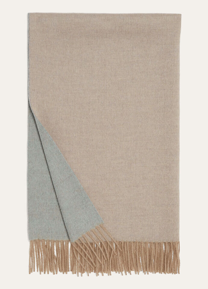 In the grand tapestry of the collection, accessories are the golden threads that weave together past and present, each subtly symbolizing the brand’s century-long commitment to uncompromising elegance. The classic two-tone stole, now in sumptuous pure cashmere, drapes elegantly over your shoulders. The contrasting colors on each side and the uniquely colored fringes along the short edges create a versatile accessory to lift any ensemble.