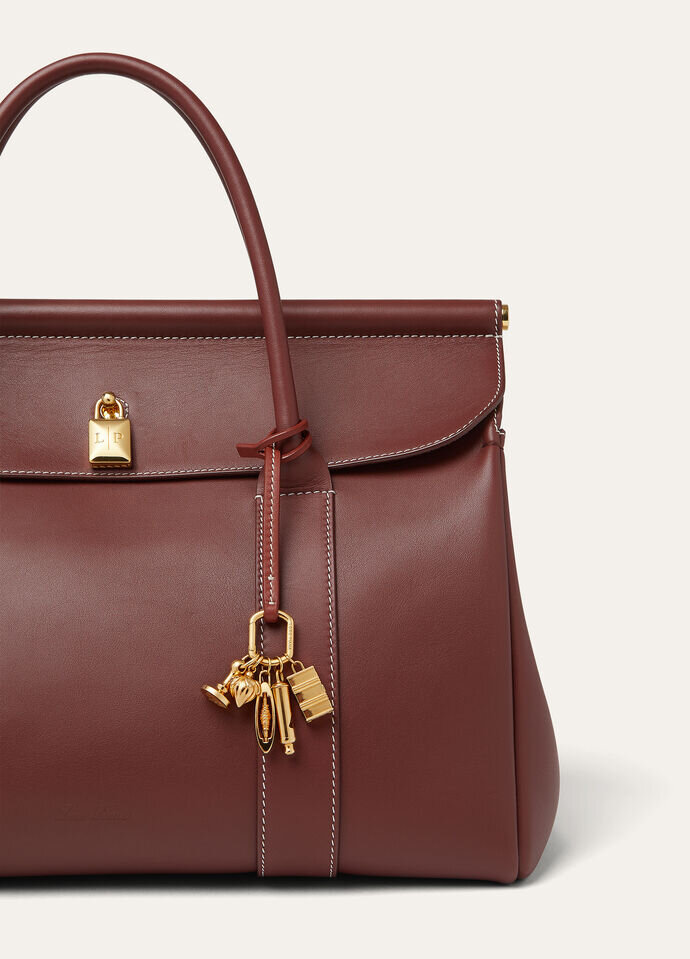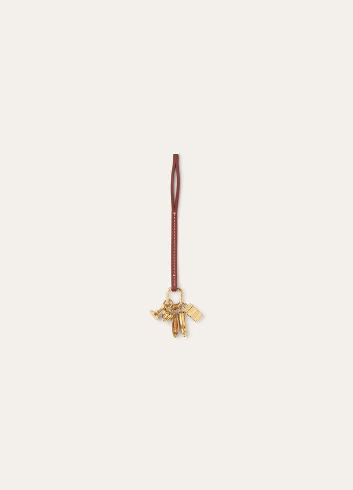 The Anniversary bag charm, a tribute to Loro Piana’s anniversary made of five charms, each celebrating core symbols of the brand: ​the linen flower bud, the suitcase stripe,​ the bobbin, the stamp featuring the brand’s crest, and a playful element is added with a whistle charm.​ Held together by a ring and attachable to bags via a leather lanyard, these charms are a playful yet sophisticated way to personalize one’s accessory.