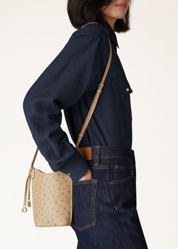 Like strokes on a canvas, accessories reflect our inner artist, from bold statements to subtle nuances, each a tribute to our unique selves. Echoing the braided handles of the Bale, this crossbody phone case in exclusive ostrich leather brings signature refinement to personal on-the-go tech protection. Card slots are discreetly tucked away at the back, while optional My Charms offer a custom touch.