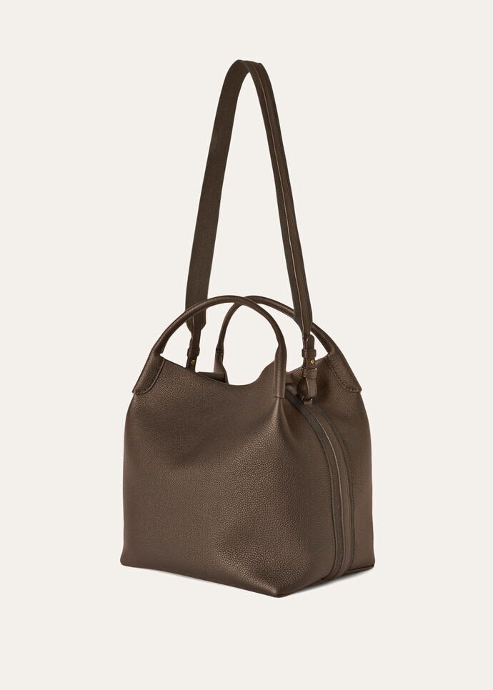 The Bale, a sophisticated bucket bag in a large size with handstitched handles, inspired by Loro Piana’s textile heritage. Its silhouette, touch, and feel recall the cashmere bales, large bundles of the raw precious material. With a seamless design and unique lightness, the Bale bag is a celebration of supple softness and encapsulates the savoir-faire of the Maison. Effortless and casual, it is ideal for carrying all daily essentials with ease. The bag can be carried by hand or crossbody thanks to its removable strap.This handcrafted style is made from calfskin with an exceptionally soft, uniform natural grain.