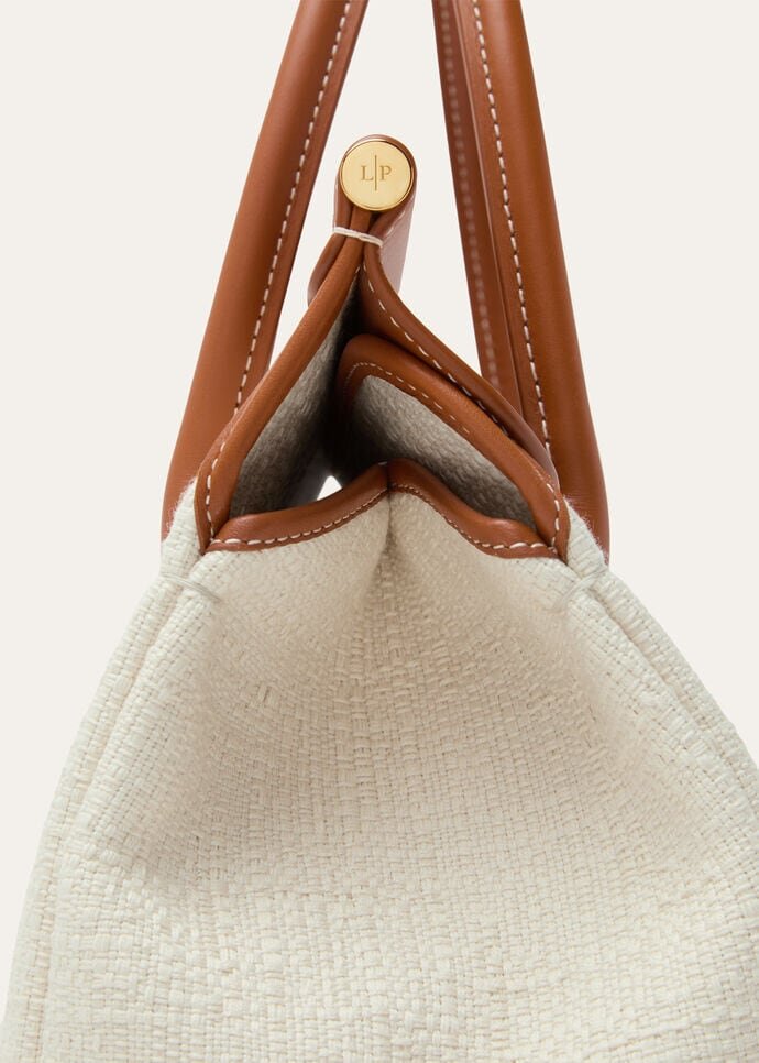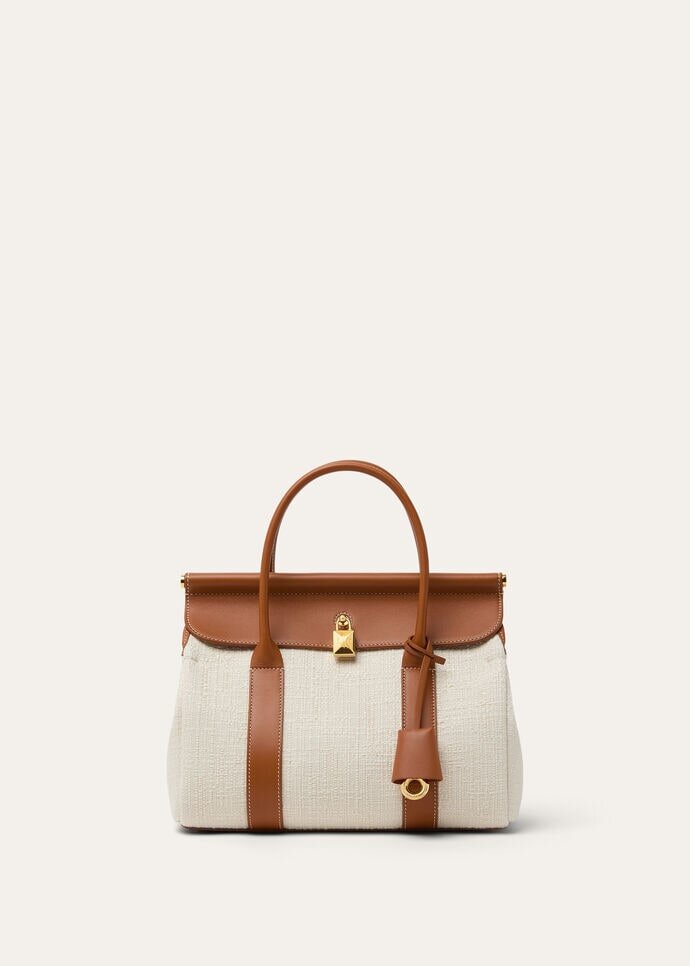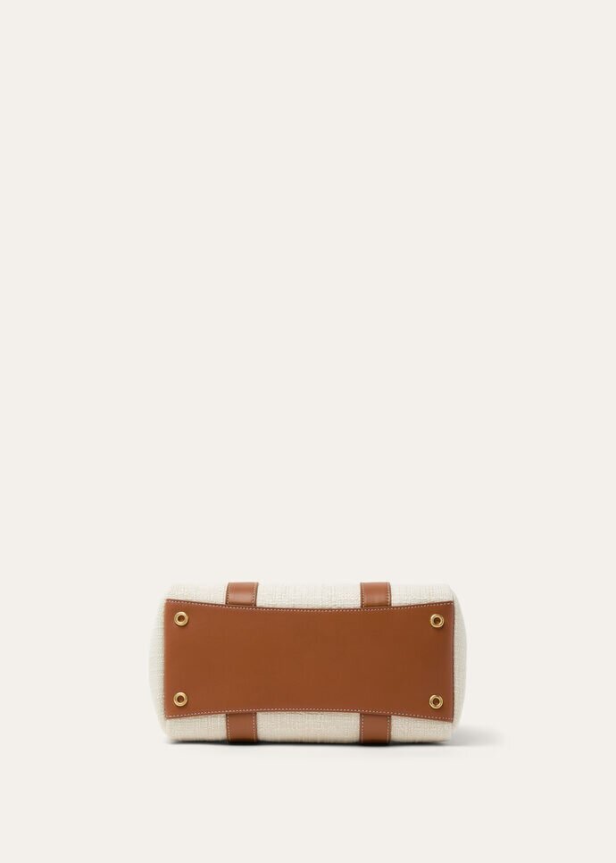 The Loom bag pays homage to Loro Piana’s centuries-old textile heritage, with the metal bar beneath the flap evoking the gentle cascade of fabric draped across an artisan’s loom – a subtle nod to the brand’s storied weaving techniques. Beautifully crafted in jacquard cotton fabric, the refined padlock that closes the bag can be unfastened, giving it a more relaxed look. Loom can be worn closed or open without losing charm and personality. Even when worn unfolded, the bag gracefully closes by itself. The bag can be carried crossbody.
