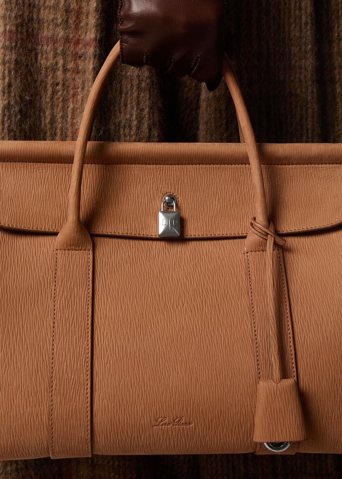 The Loom Bag L32 pays homage to Loro Piana’s century-spanning heritage in fabrics and fibers – the metal bar beneath the flap evoking the gentle cascade of cloth draped across the textile loom. Crafted in textured Nubuck Zibeline leather, it is anchored with a refined padlock that can be worn closed, or open for a more relaxed look, that retains its signature charm. The timeless accessory is ideal for carrying in the hand.