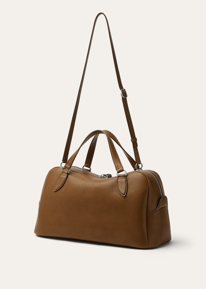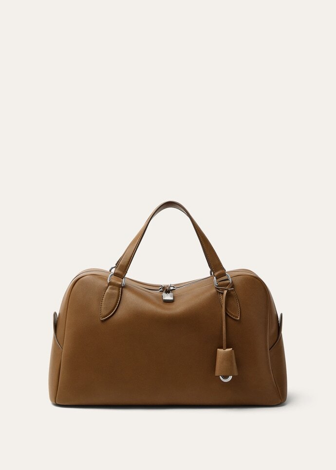 Here presented in a medium size, the Needle is Loro Piana’s interpretation of the bowling bag, complete with iconic LP charms. Evoking the Maison’s textile heritage, it is inspired by the bags used to carry knitting needles. It is constructed with soft sinuous lines, allowing for versatile wear over the shoulder or in the hand. Crafted from supple Velvet Calf leather with a smooth suede lining, it has a harmonious silhouette and is made with a single piece of leather along the sides.