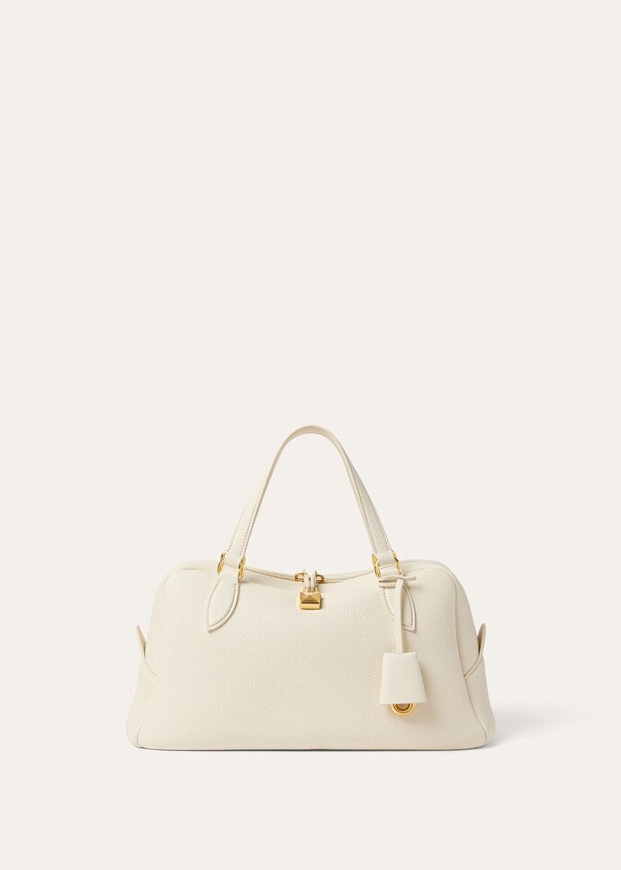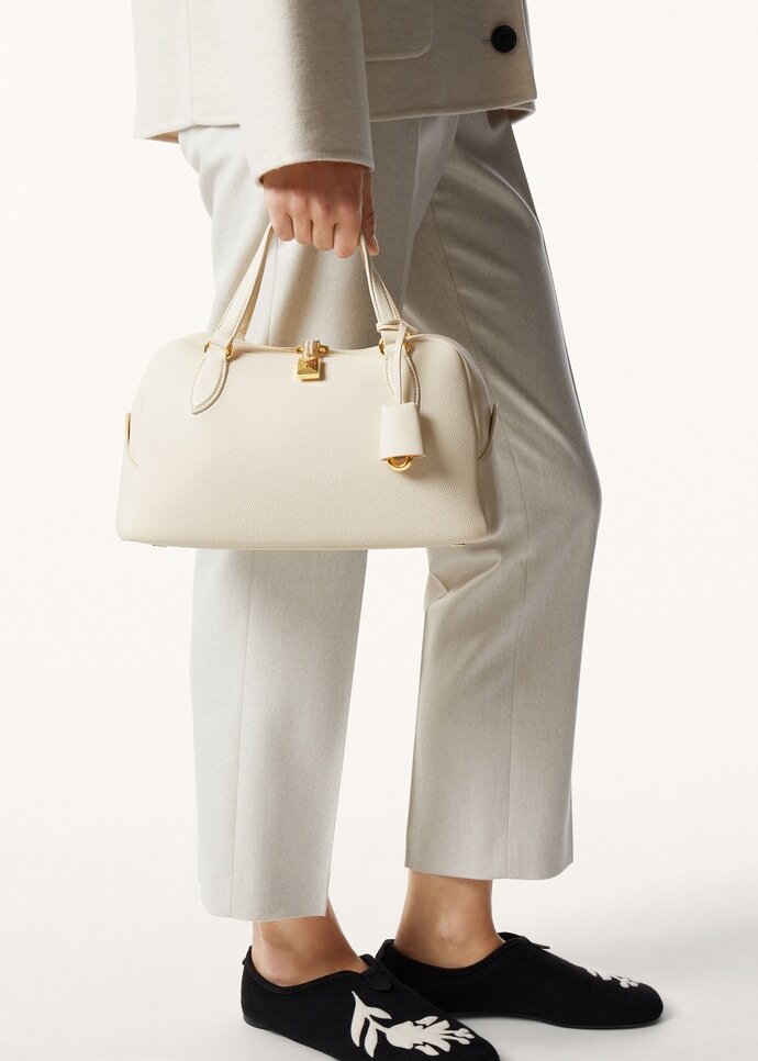 Here presented in a small size, the Needle is Loro Piana’s interpretation of the bowling bag, complete with iconic LP charms. Evoking the Maison’s textile heritage, it is inspired by the bags used to carry knitting needles. It is constructed with soft sinuous lines, allowing for versatile wear over the shoulder or in the hand. Crafted from fine-grained leather with a velvety suede lining, it boasts a harmonious silhouette and is made with a single piece of leather along the sides.