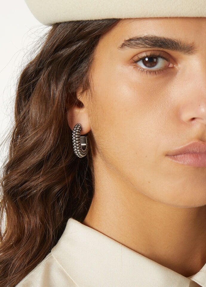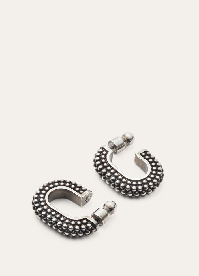The Bubble earrings weave a narrative of quiet sophistication, their intricate details inviting contemplation. The open hoop design embraces the earlobe with a delicate interplay of texture and light, the pre-formed bubble-pressed plates contrasting with the smooth brass base. These elegant pieces add a touch of understated glamour to any ensemble.