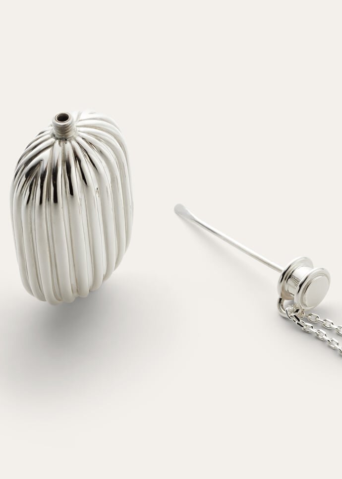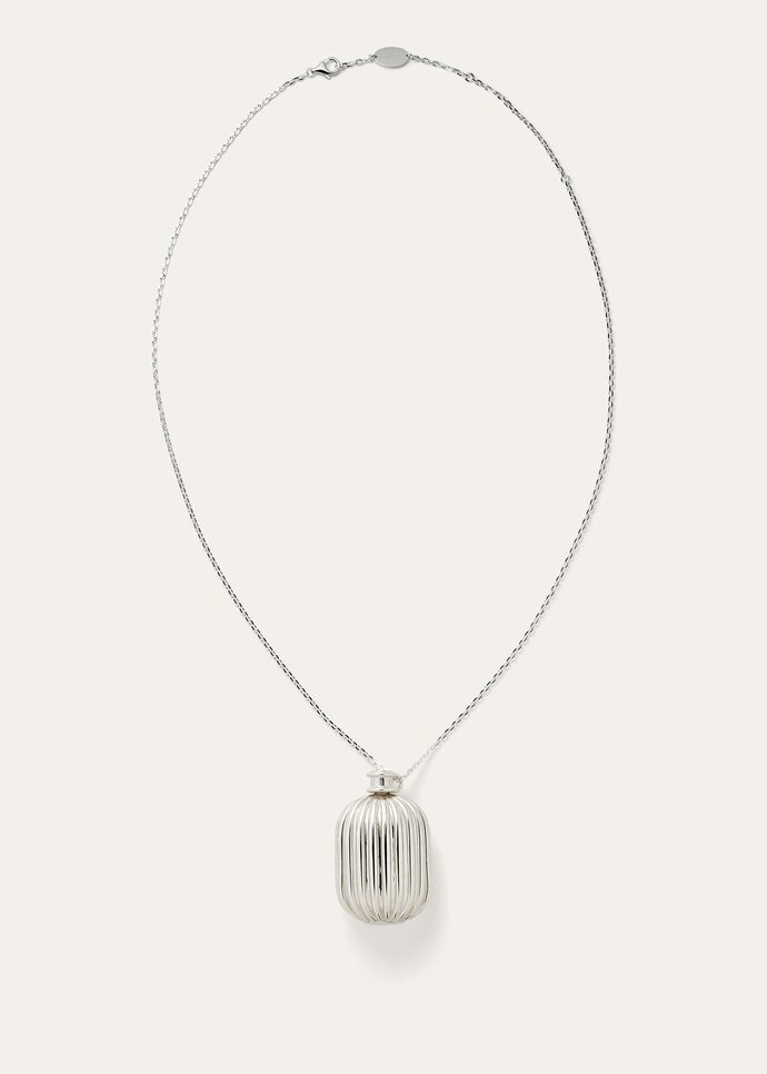 A slender silver perfume bottle brings quiet refinement to everyday rituals. It is traced with a delicate ribbed pattern and an engraved logo accent and comes suspended from a chain necklace. Finished with a removable cap, it reveals a small funnel for effortless refilling.