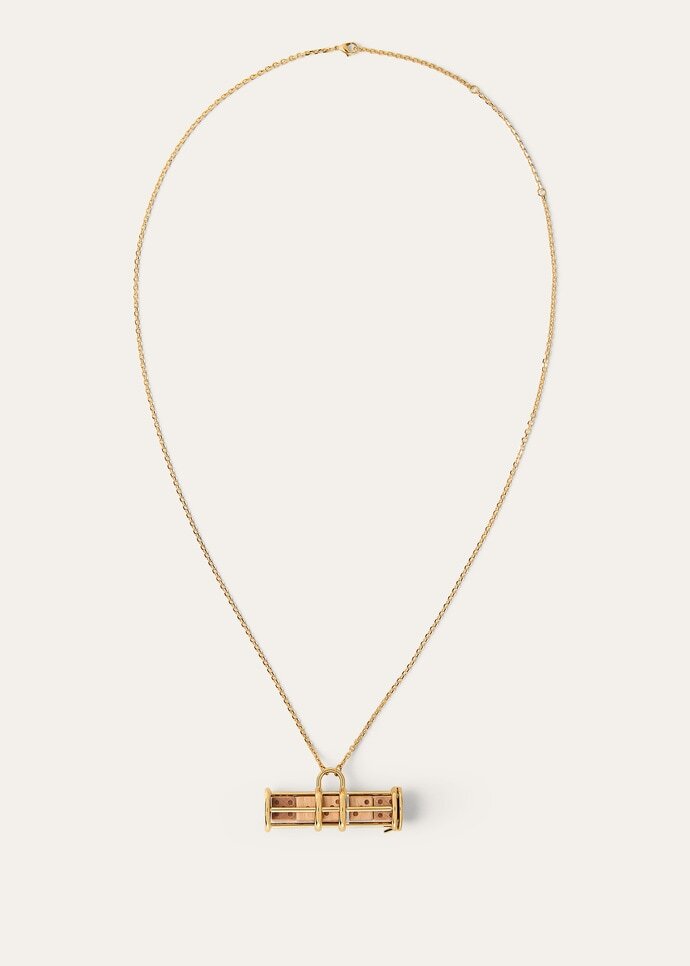 A unique and discerning accent to the Loro Piana silhouette, this necklace houses a geometric pendant that opens to release five miniature wooden dice. Playful and refined in equal measure, it is rendered in brass for an elegant look.