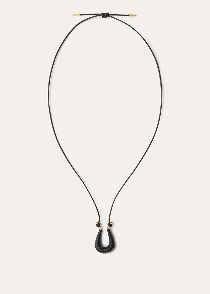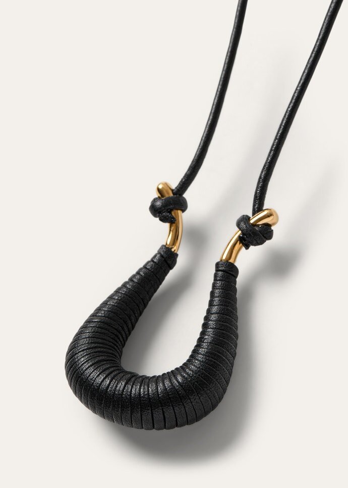 The Duo necklace makes for a sophisticated finishing touch to the Loro Piana silhouette. Suspended from it is a defining pendant in light-reflecting Sun Gold brass, which is meticulously wrapped with strips of leather until fully covered. Complete with a slender leather cord, it coordinates perfectly with the earrings from the line.