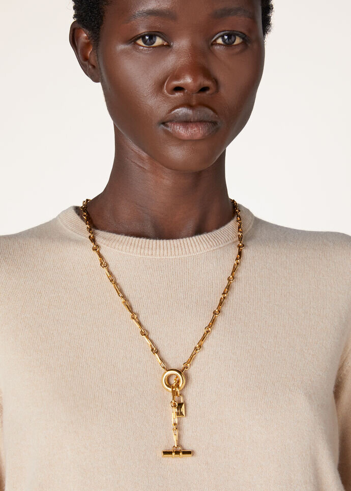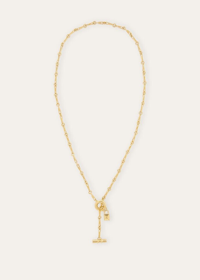 Bright brass links meet in a toggle clasp, with a padlock charm adding decorative charm. Wear it with knitwear and denim for a casual ensemble, or accent a silk dress with it for a soirée.