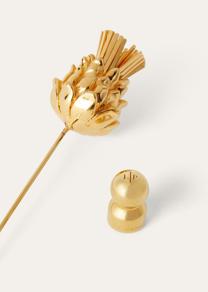 Slide this brass brooch onto your lapel and feel its weightless elegance rest against the fabric; the thistle blossom at the tip is intricately detailed, a subtle nod to the Loro Piana coat of arms. Complete your ensemble by adding this discreet yet distinctive accessory to hats, scarves or capes.