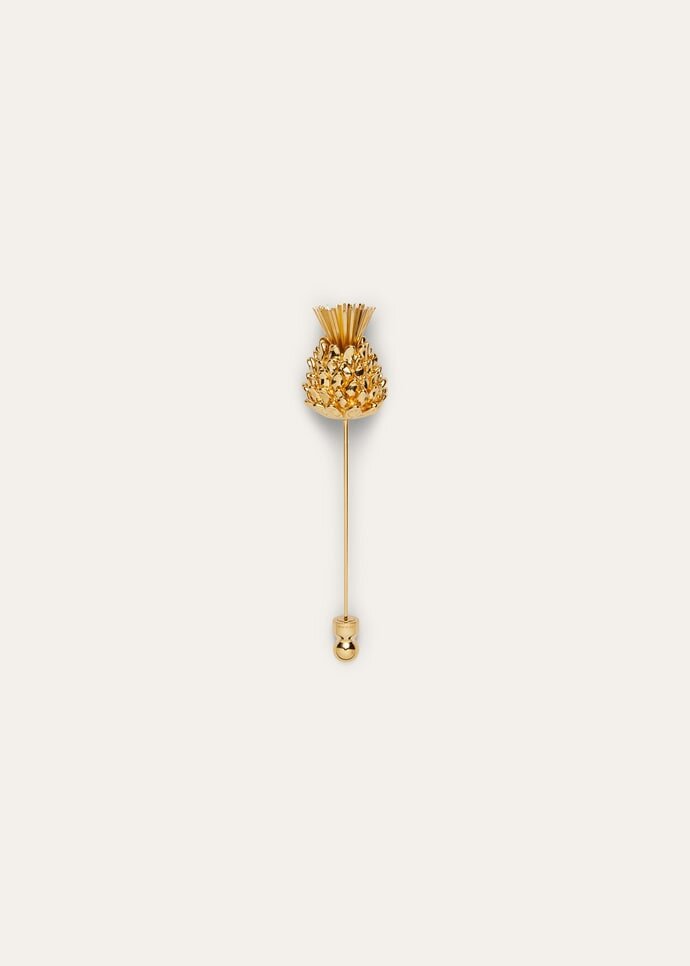 Intricately interwoven with Loro Piana’s textile heritage, the Maxi Cardo pin is a sculptural finishing accent that imbues hats, scarves, or capes with understated elegance. Cast in brass, it features the House’s perennial thistle flower.