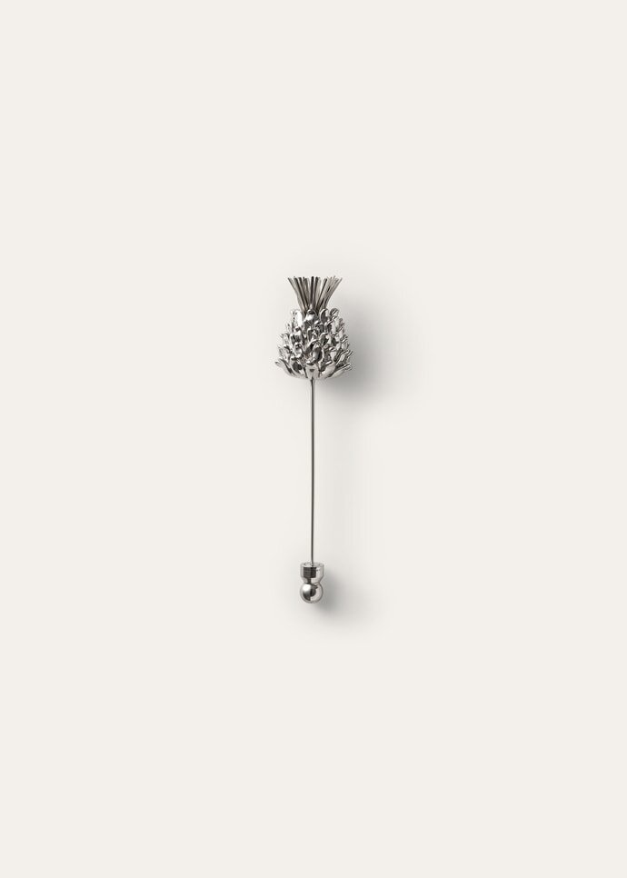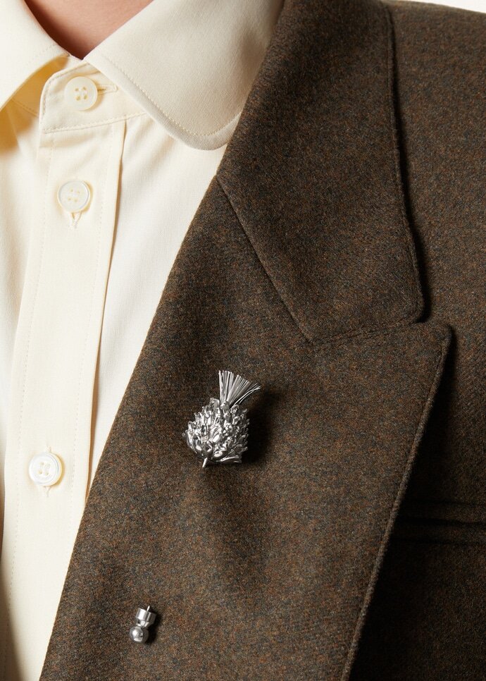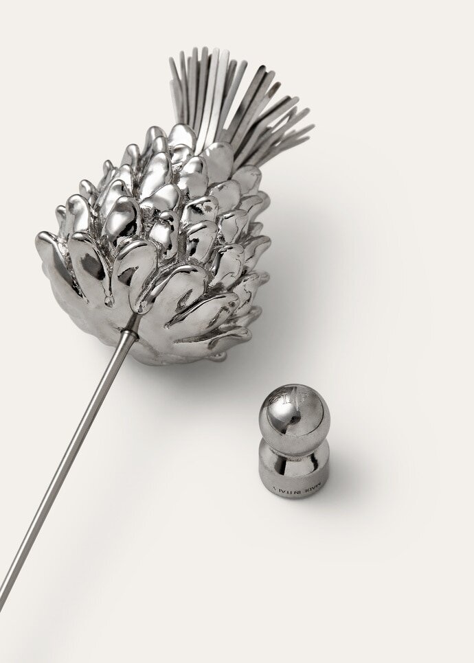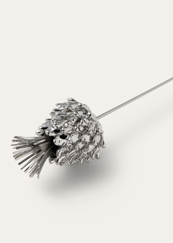 Intricately interwoven with Loro Piana’s textile heritage, the Maxi Cardo pin is a sculptural finishing accent that imbues hats, scarves, or capes with understated elegance. Cast in brass, it features the House’s perennial thistle flower.