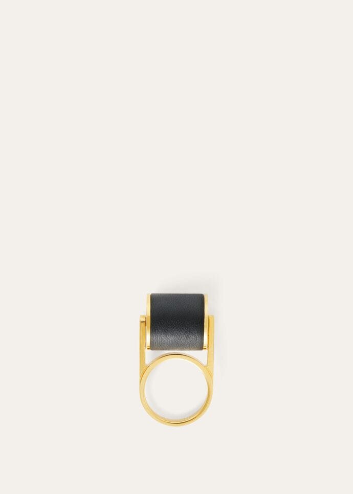In a harmonious interplay of metal and leather, the jewelry pieces in this collection reflect the mastery of craftsmanship that defines Loro Piana. This sleek brass ring, distinguished by a rotating cylinder encased in luxurious rounded calfskin leather, is a beautiful example. The subtle yet captivating detail renders it timeless.