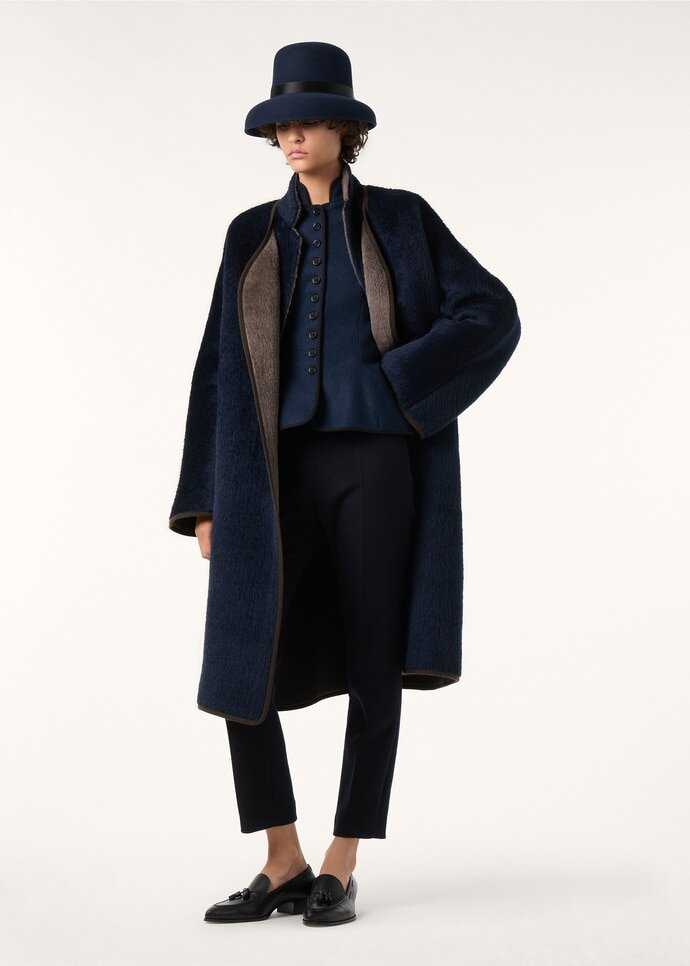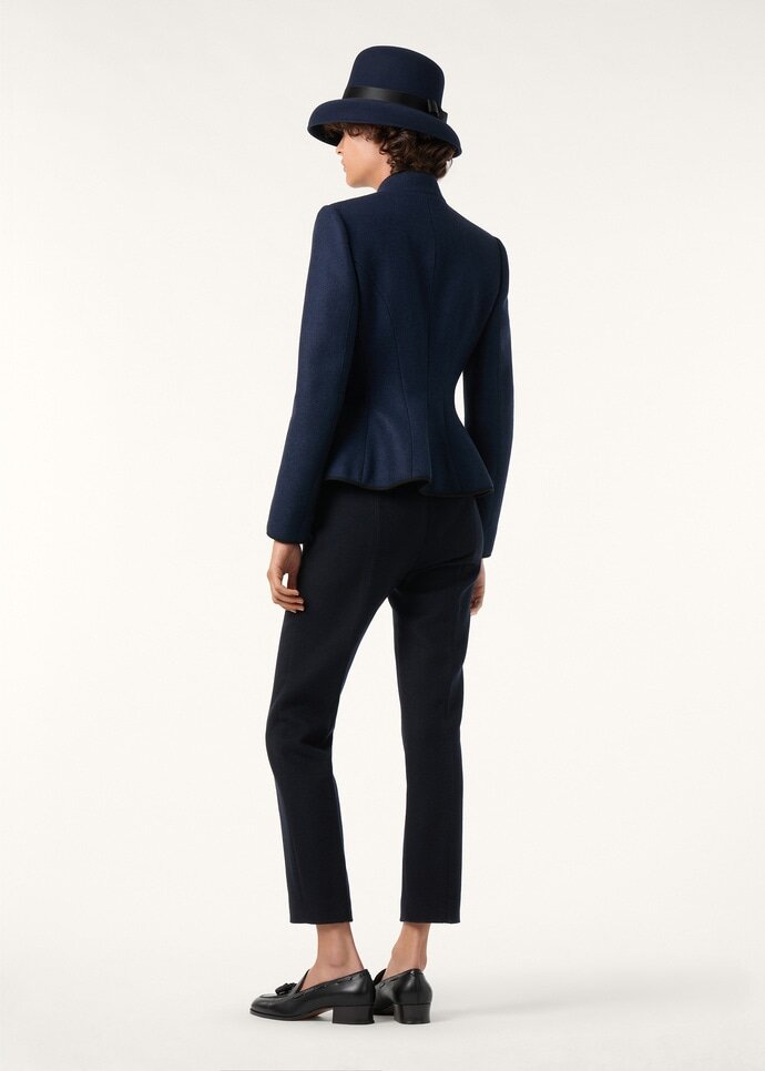 Interpreted through a feminine lens, the Sabry jacket is shaped with a high collar and a sharply defined peplum. It is tailored from pure cashmere, triple-woven to achieve a dense winter weight with an enveloping, sensorial warmth. Fully lined in silk for comfort within, it is finished with tonal flannel piping and a precise row of Sergio horn buttons that lend a note of refined polish.