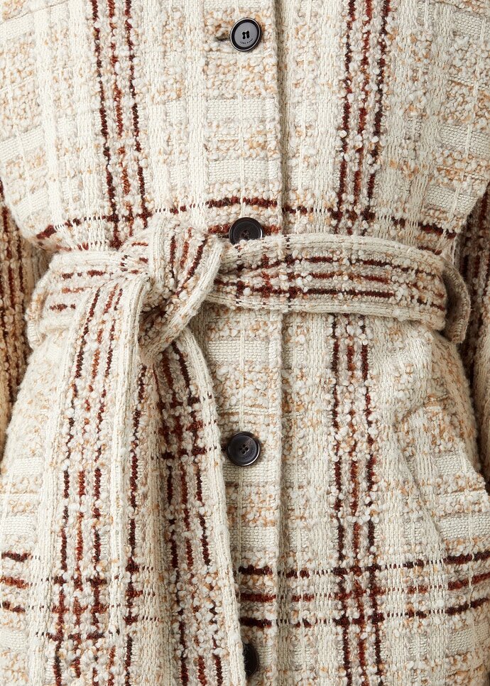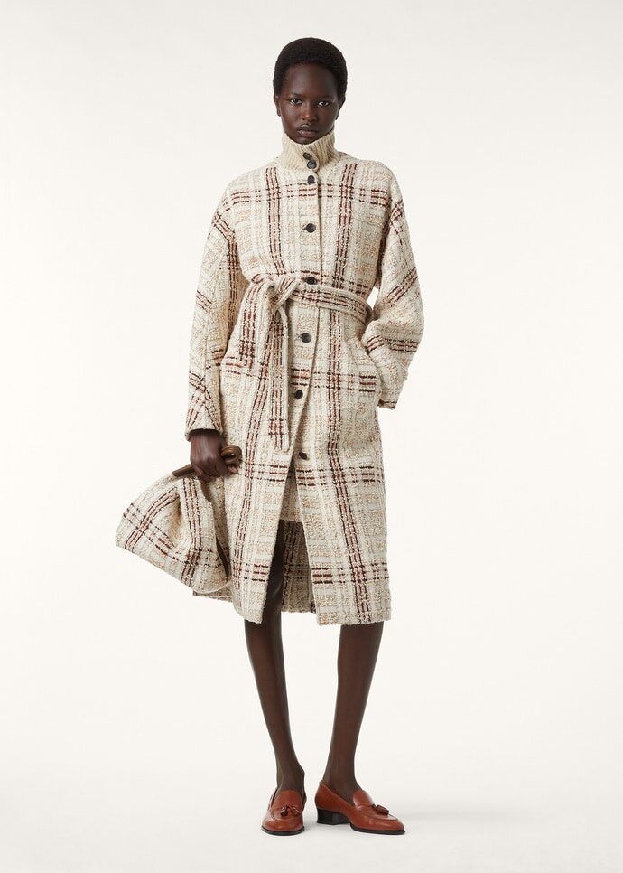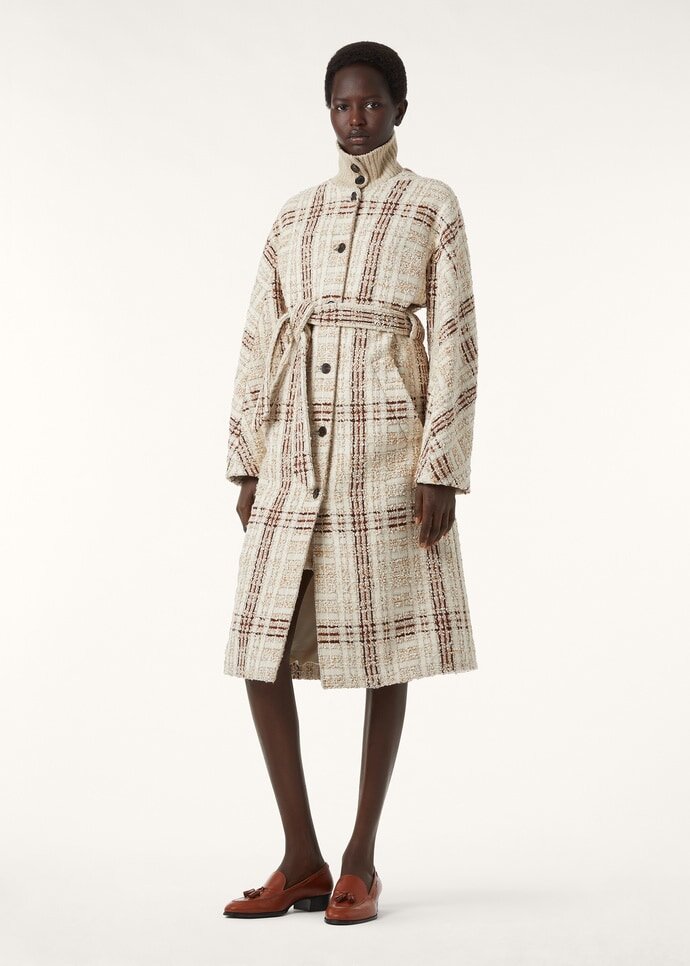A heritage-steeped tartan pattern enlivens the Syd coat, rendered in a classic tweed fabric with touches of precious cashmere and silk. The standing collar offers a subtle tactile contrast, while the matching belt, which fastens through wide loops, cinches the silhouette.