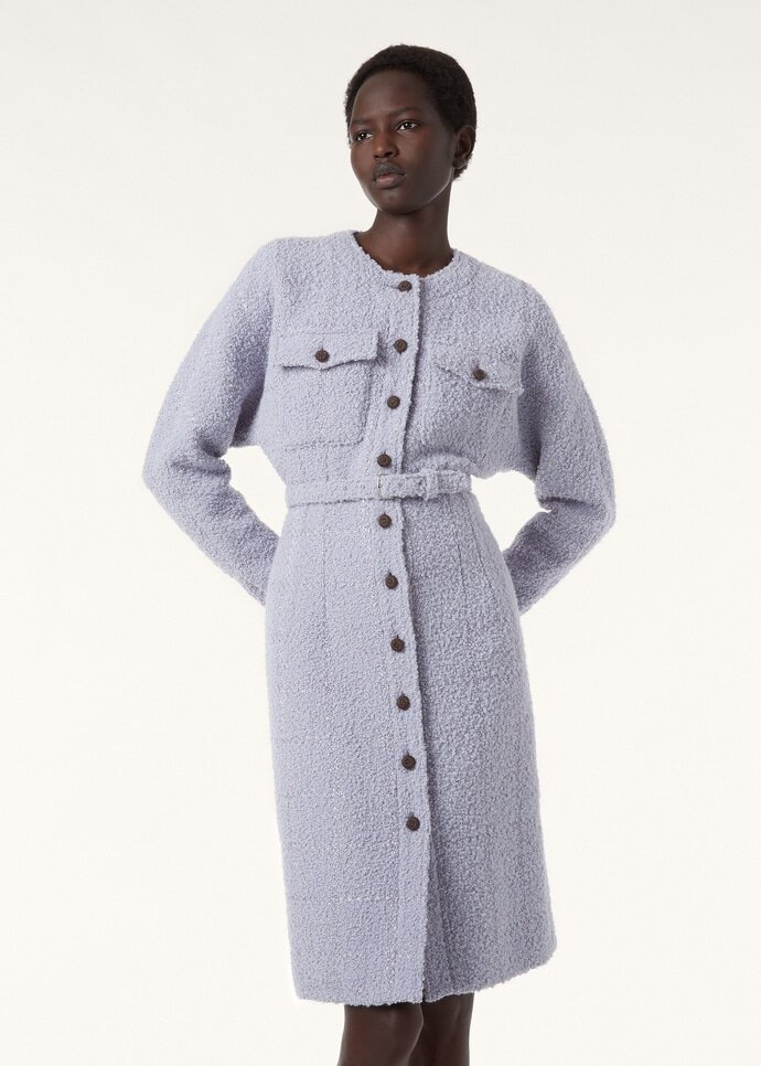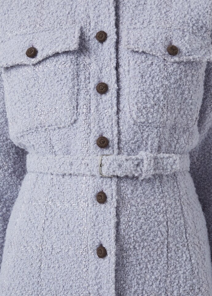The Manon shirt dress is made from tactile bouclé blended with alpaca, wool, silk and linen and worked with a tonal overcheck pattern. It is shaped with a round neckline and kimono-style sleeves, then cinched at the waist with a leather-lined tie belt for a feminine silhouette. Intricate edging along the neckline, front and cuffs lends a polished finishing note.