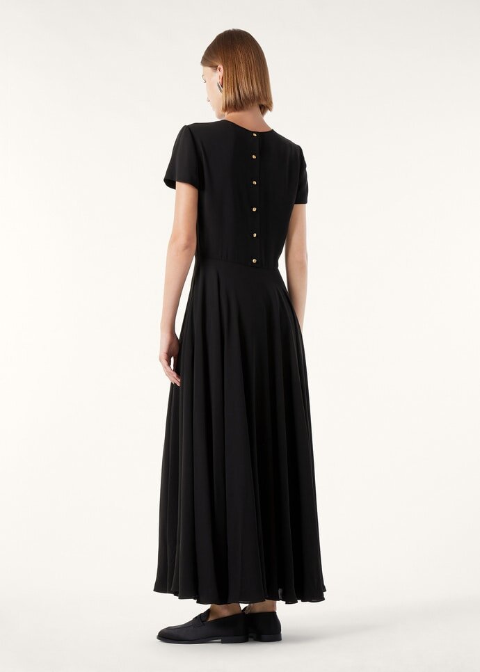 With its luminous shine, the Poline dress moves with a sense of fluidity and grace. Its neat calf-grazing silhouette is cut from sablé crepe silk, revealing a refined grainy texture with a subtle flecked finish that plays softly with the light. The clean waist seam elegantly defines the line before cascading into a full flowing skirt.