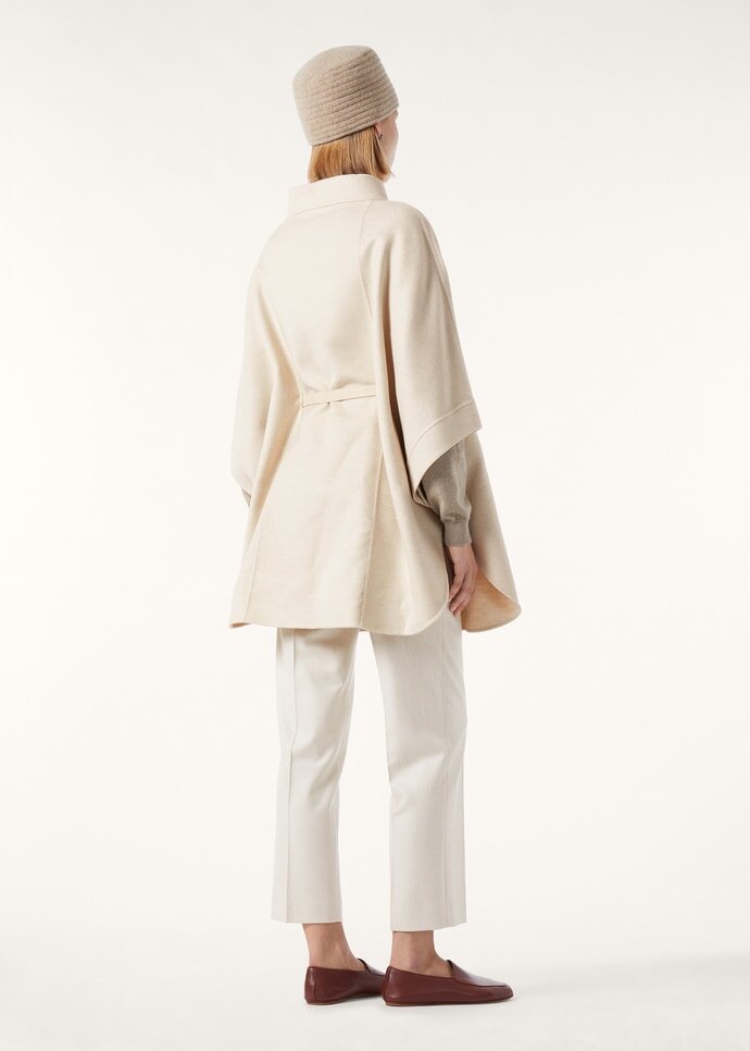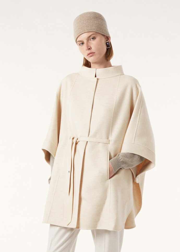 Iconic cape in cashmere double styled with a classic cut. Below hip length. It can be worn with the plongé leather belt to highlight the waist, or without for a softer, more flowing line. Elegant and versatile, ideal with formal looks.