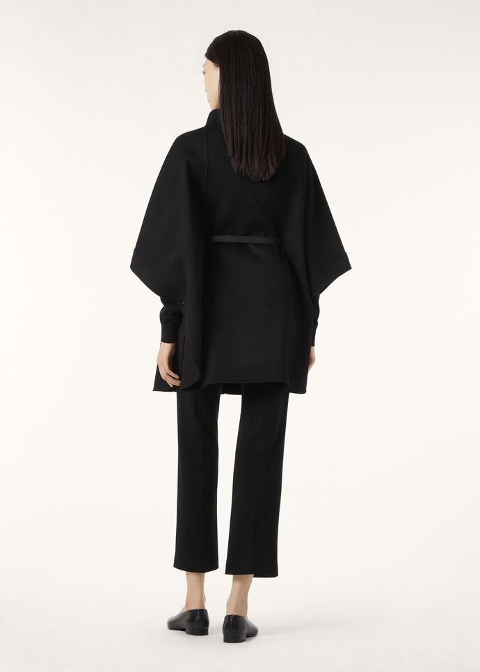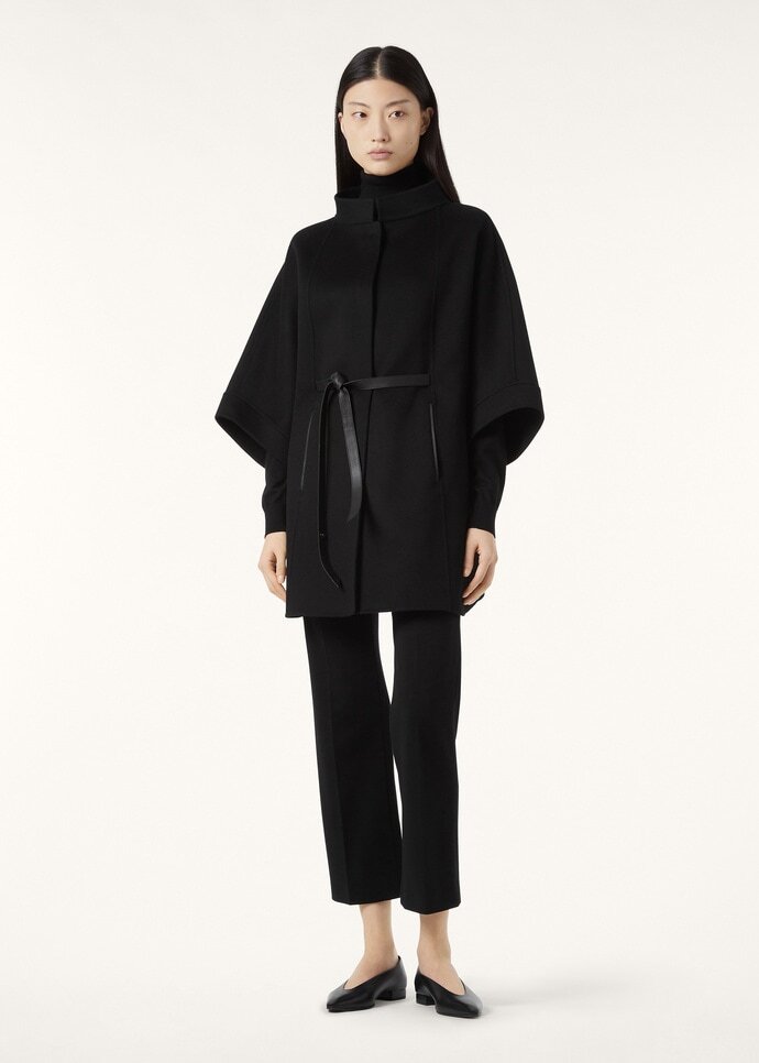 Iconic cape in cashmere double styled with a classic cut. Below hip length. It can be worn with the plongé leather belt to highlight the waist, or without for a softer, more flowing line. Elegant and versatile, ideal with formal looks.
