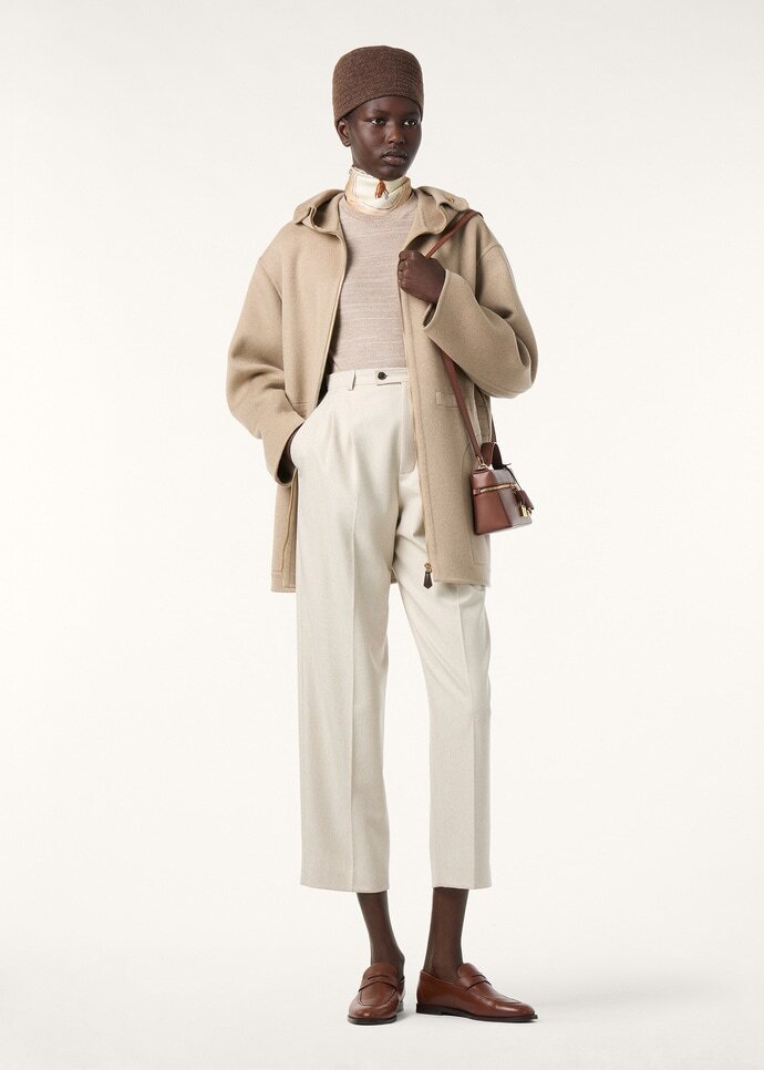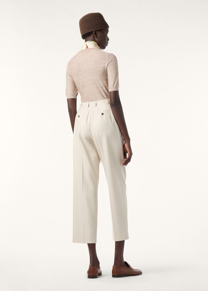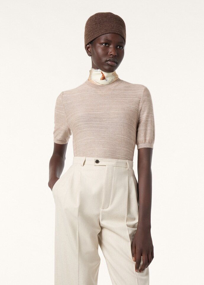 Designed with a minimal line, the Lachlan crewneck sweater is crafted from slubbed cashmere and silk bouclé spun in two tonal shades to create a subtle play of light across the surface. This short-sleeved silhouette is shaped with a crewneck and neatly framed with fine ribbing at the collar and hem for a composed finish.