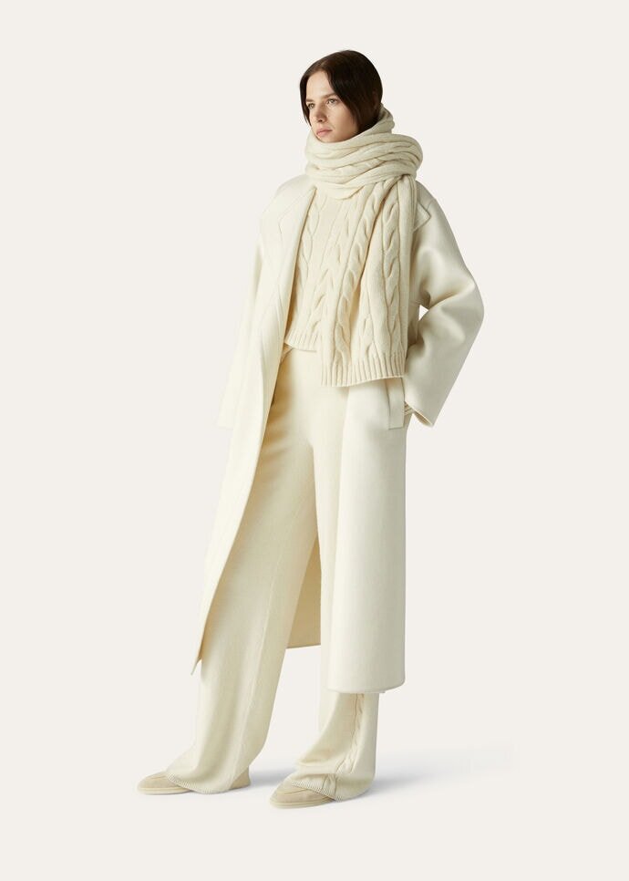 Cropped crewneck made from Coarsehair® baby cashmere mélange yarn. The weave is enhanced by an extremely soft, fluffy textured knit pattern, accentuating the cashmere’s naturally light weight. This flowing, cozy style is defined by a boxy cut.
