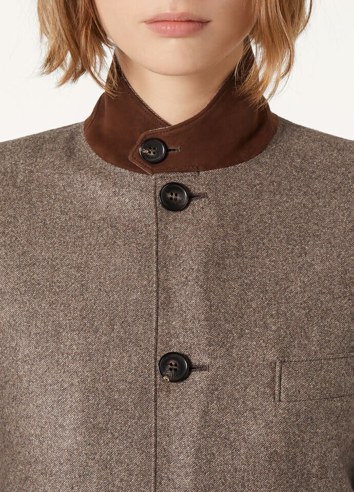 A special edition jacket created to celebrate the 75th anniversary of the Villa d’Este Concorso di Eleganza. Originally an iconic piece from the men’s outerwear collection, it has been reimagined with a relaxed, feminine silhouette. Exquisitely crafted from wool and cashmere, the fabric is fulled to create the distinctive look of brushed flannel with a raised pile, offering both a timeless look and an inviting feel.