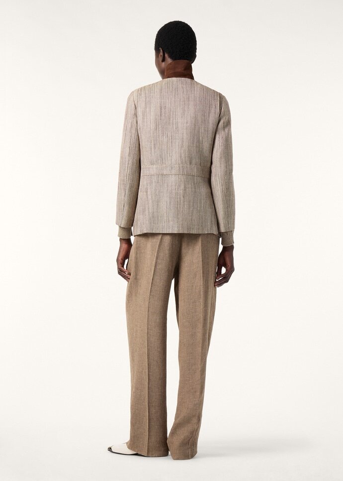 Modeled on the men’s version, with influences drawn from the world of classic cars, the Roadster Mini is the ultimate driving jacket, revisited here with a relaxed, feminine line. Versatile, lightweight and wind-resistant, this rendition is crafted from wool, silk and linen chevron with a rich three-dimensional touch and slubbed finish.