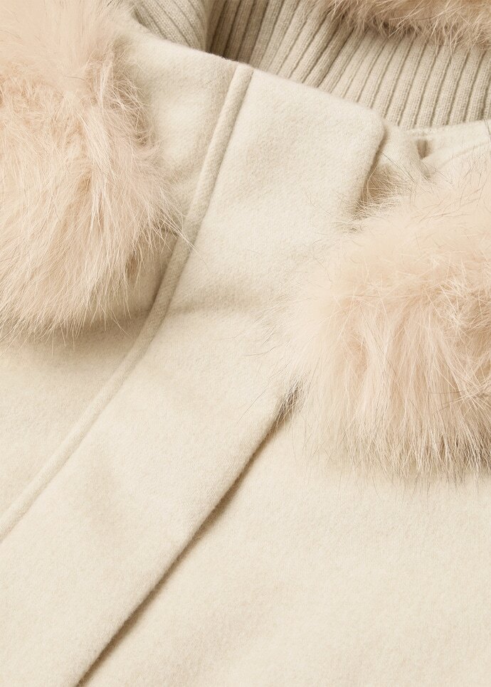 Trim: collar 100% cashmere, hood 100% cashmere, hood edging 100% fox fur