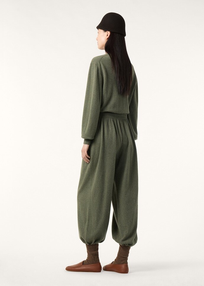 In a flowing, elongated line, the Classic jumpsuit is crafted from pure baby cashmere for enveloping softness. The fibers are sourced from the delicate underfleece of young Hircus goats – a precious raw material of exceptional rarity and softness. An adjustable drawstring lends an air of femininity, elegantly framing the metal buttons through the bodice.