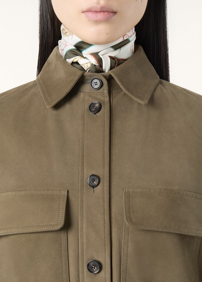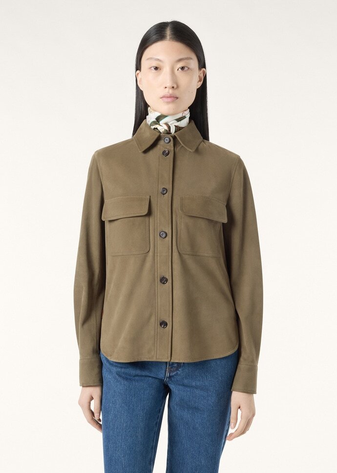 The Ana shirt is crafted from ultra-fine suede, treated for a feather-light feel and meticulously dyed through a specialized process to achieve full, vibrant color. A discreet water-repellent treatment adds a practical finish without compromising softness. Cut in a regular fit, the design is detailed with rounded side slits for effortless ease of movement.