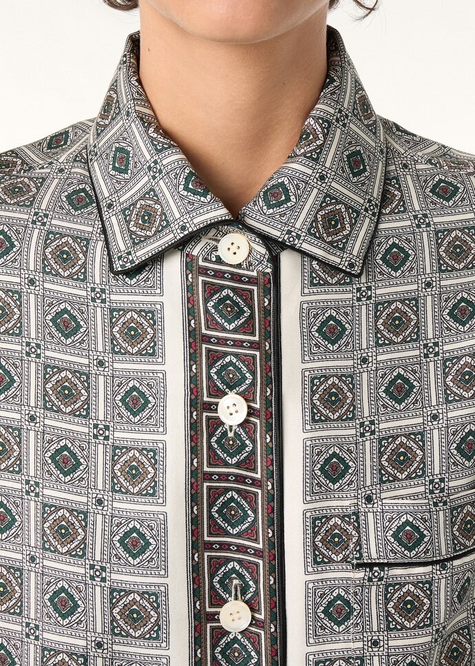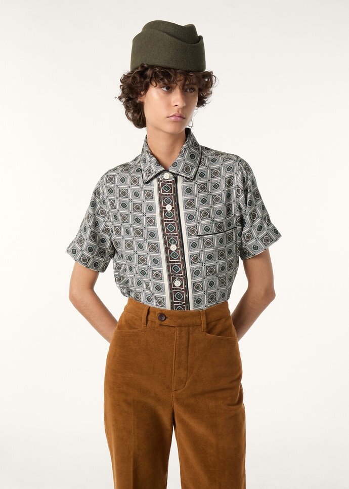 From Loro Piana’s Lingerie Capsule, the Angelina shirt reimagines the art of at-home elegance. It is spun from pure silk for natural fluidity, lightness and comfort, and is emblazoned with the Mendoza Border print celebrating the eponymous city in Argentina. A row of Sergio buttons in iridescent mother of pearl runs from the André-inspired collar to the hem.