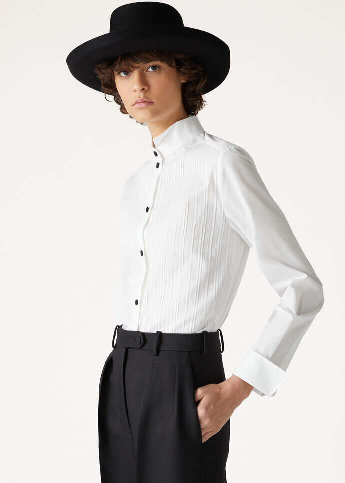 In the soft glow of the evening, the Hadiya shirt emerges as a vision of refinement untouched by the passing of time. This elegant cotton-poplin piece has a classic cut and a band collar with a small leaf detail for a refined silhouette. The lustrous silk-blend pleated bib at the neckline adds a touch of textural intrigue, while the silk-covered buttons and cufflinks set this shirt apart.