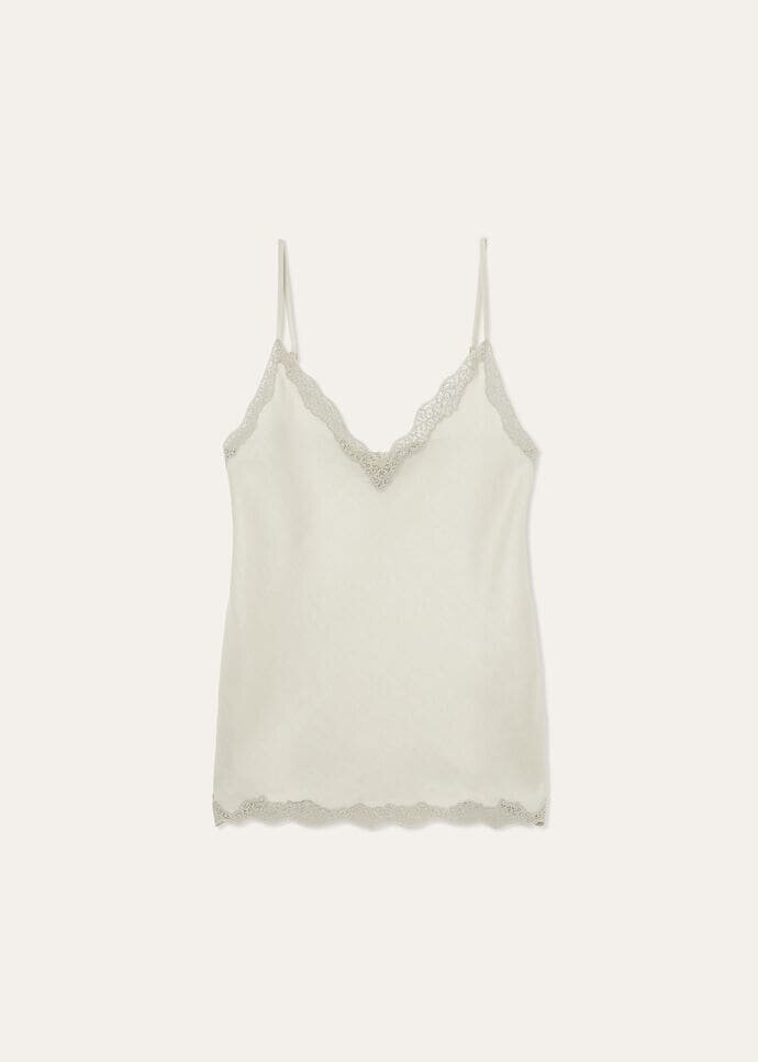 The serene comfort of nightwear blends beautifully with the natural grace of linen. Experience summer elegance with the Katerina camisole top, which has a charming V-neckline and adjustable shoulder straps for a flattering fit. Delicate cotton Guipure floral motifs adorn the neckline and hem, front and back, adding a romantic charm to this versatile, breathable piece.