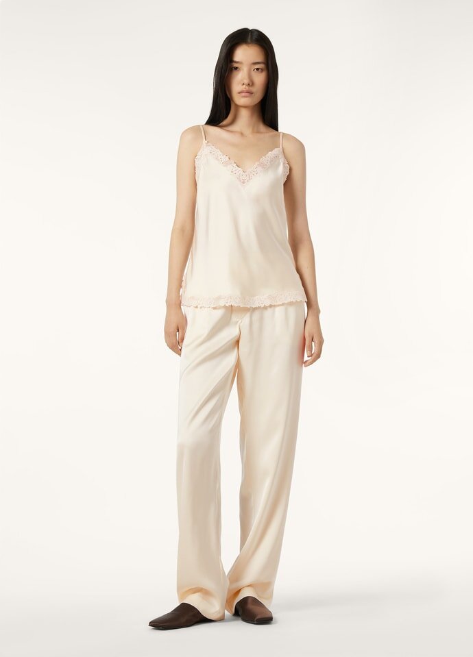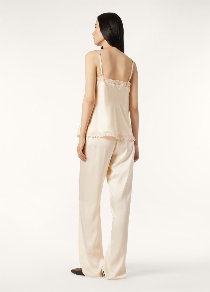 A versatile garment from the Lingerie Capsule, the Katerina camisole provides comfort and graceful sophistication. Crafted from Dressy Satin with a lustrous finish on both sides, it offers incredible softness and enveloping feel against the skin. Floral silk Guipure lace graces the subtle V-neckline and hem, evidencing the Maison’s eye for detail and intricate craftsmanship.