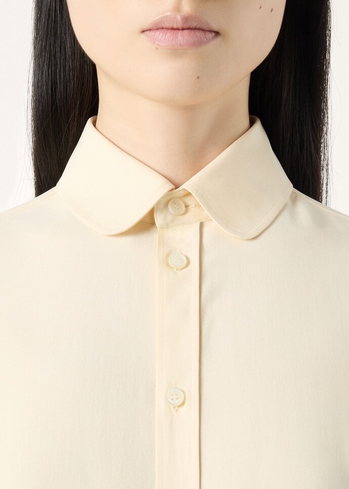 Brimming with classic tailoring cues, the Thea shirt is a refined wardrobe essential. It is woven from Porcelain Silk, worked with utmost delicacy and care for a smooth hand. The straight profile falls neatly to the hip, framed by a rounded collar and traditionally finished cuffs that lend the piece discreet definition.