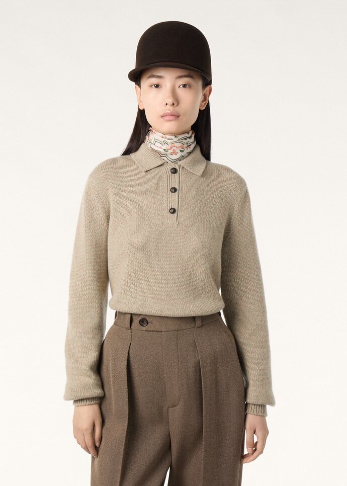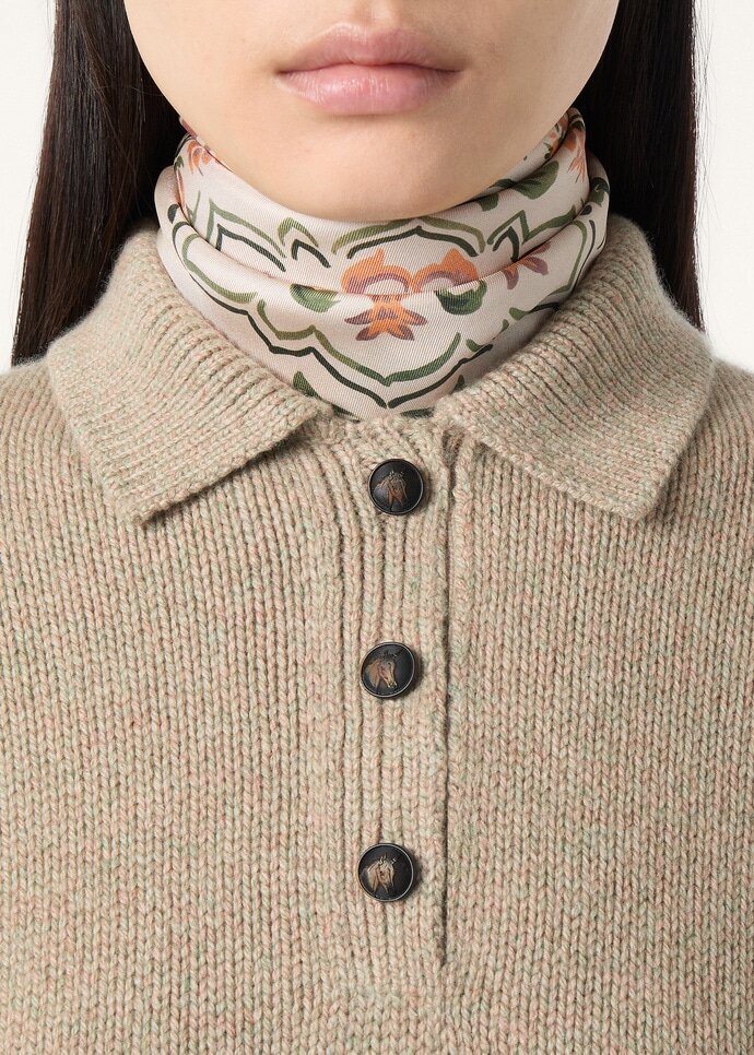 A refined essential for everyday wear, the Fyvie shirt from the Loro Highlands Capsule collection is crafted from precious baby cashmere with a soft, downy touch. It is cut with a classic polo collar and dotted with horn buttons that are detailed with a horse head motif.