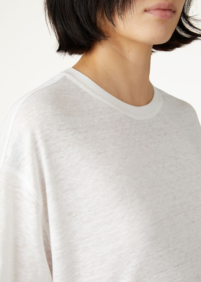 Spacious, loose-fitting, short-sleeved T-shirt made from pure linen jersey. The fresh, flowing fabric is treated with an extraordinarily lightweight, soft aloe finish.