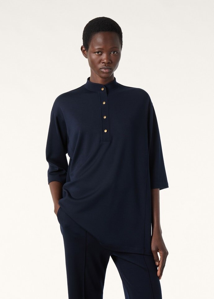 Imbued with a sense of effortless ease, the Leven top is generously cut from refined wool jersey, specially treated to enhance its softness and delicate hand feel. The flowing silhouette is elegantly framed by a knitted mandarin collar and placket, adding a discreet textural contrast. It is finished with light-catching buttons gracing the front as well as side inserts for added ease of movement.