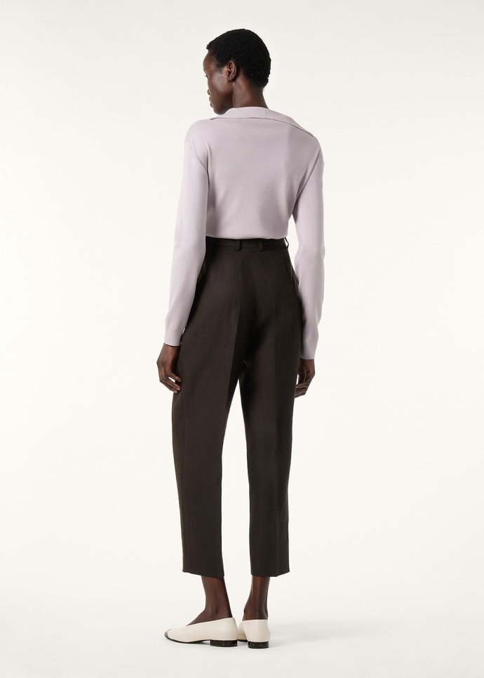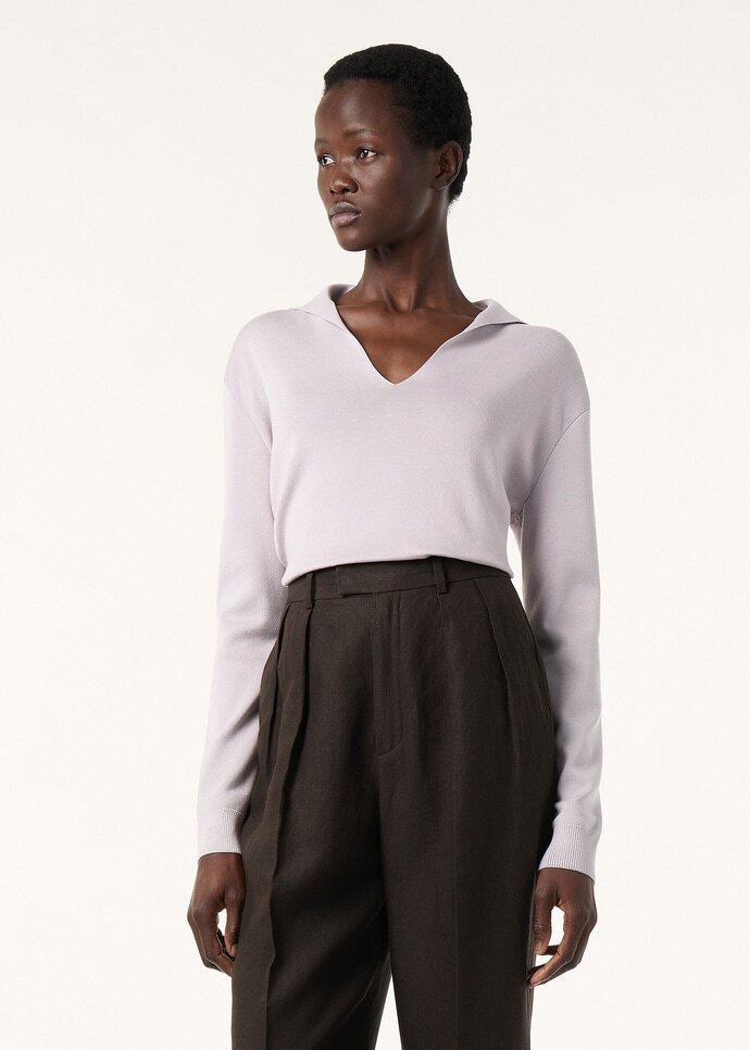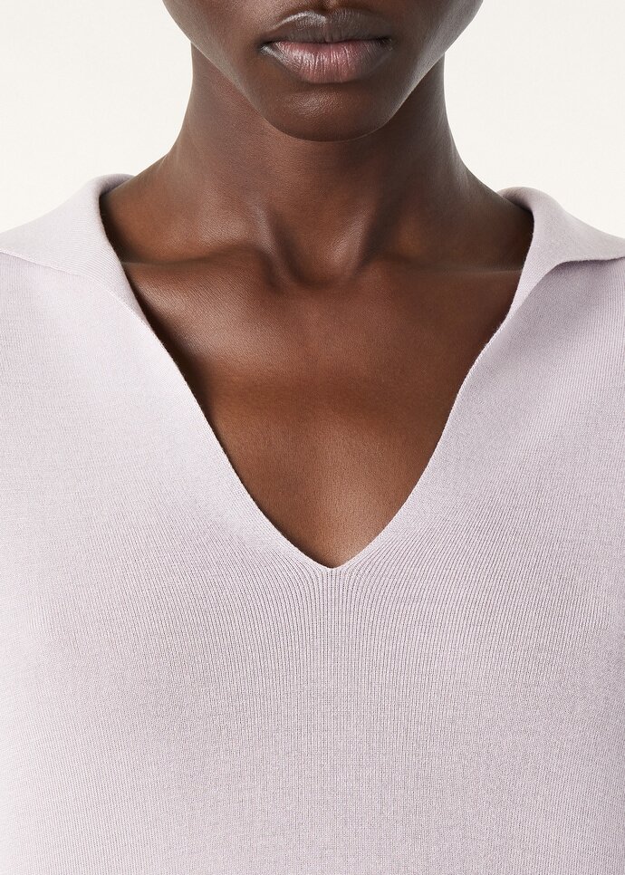 Long-sleeved polo shirt made from cotton and silk. Its minimalist cut and details are enhanced by a classic polo shirt collar with a plunging, buttonless opening, creating a versatile, feminine allure.