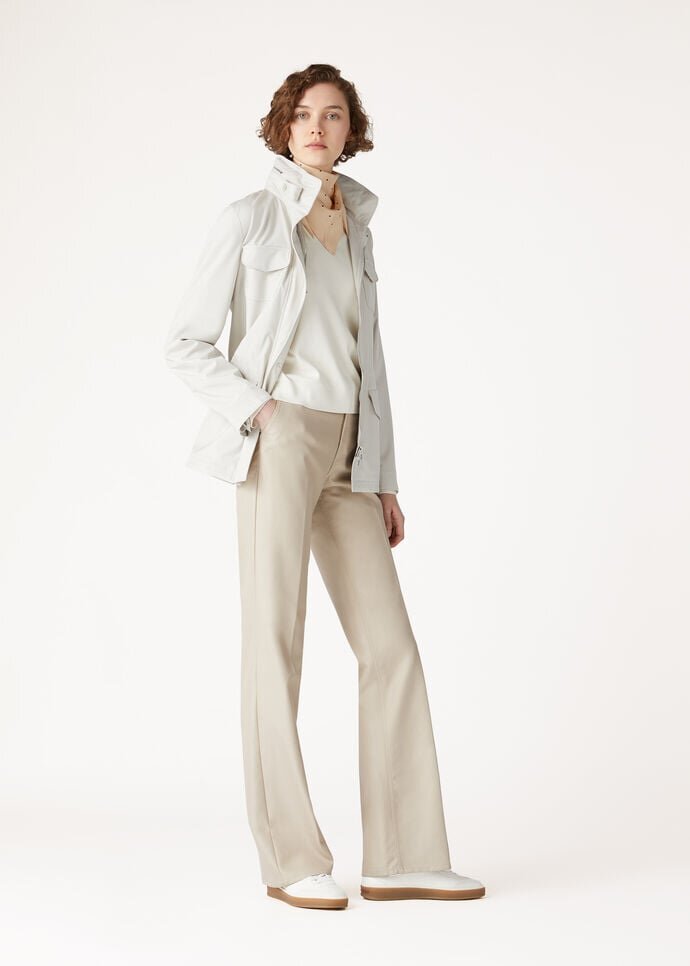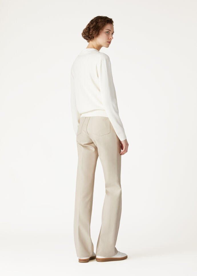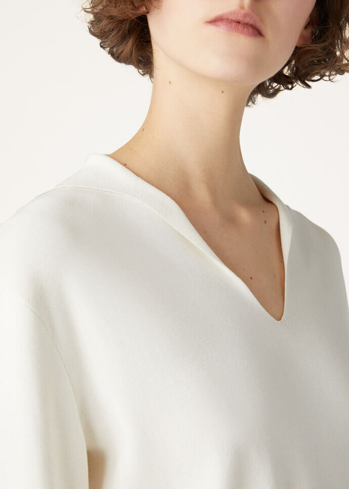 Long-sleeved polo shirt made from cotton and silk. Its minimalist cut and details are enhanced by a classic polo shirt collar with a plunging, buttonless opening, creating a versatile, feminine allure.