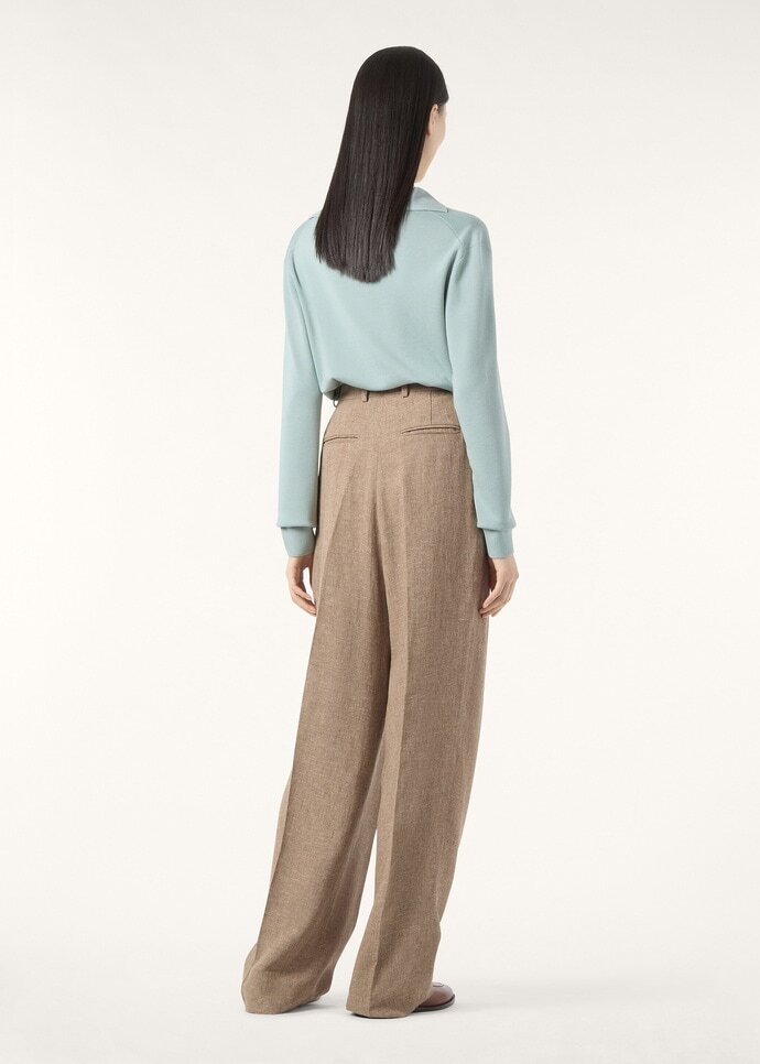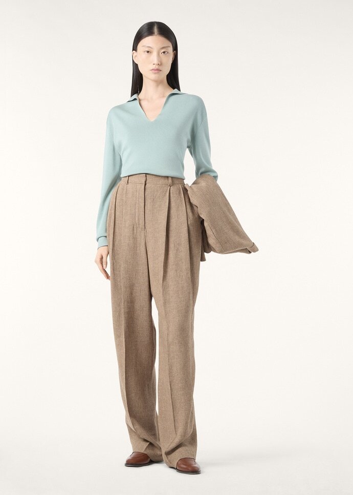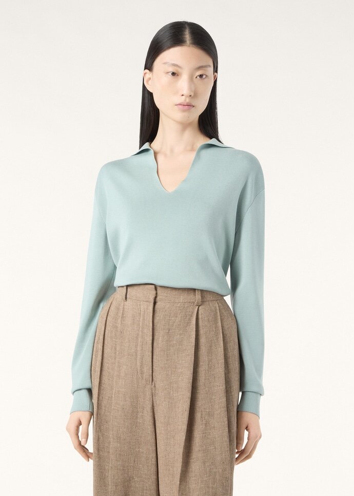 Long-sleeved polo shirt made from cotton and silk. Its minimalist cut and details are enhanced by a classic polo shirt collar with a plunging, buttonless opening, creating a versatile, feminine allure.