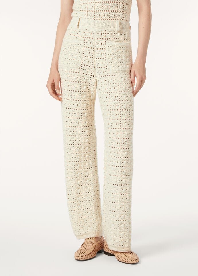 Combining luxury and craftsmanship, these straight-leg knit pants are a discreet statement of elegance. Featuring a mid-rise waist, front patch pockets, side zip and sophisticated three-dimensional check motif, they are crafted from an exceptional blend of cashmere and Abaca. The yarn combines the softness of cashmere with the durability of Manila hemp, creating an extraordinarily tactile sensation with a contemporary edge. The structured yarn allows for intricate low-fineness crochet stitches, giving the pants their unique texture. With a regular fit and ankle-length cut, these pants offer both sophistication and comfort. Ideal for those who appreciate understated luxury and artisanal excellence.